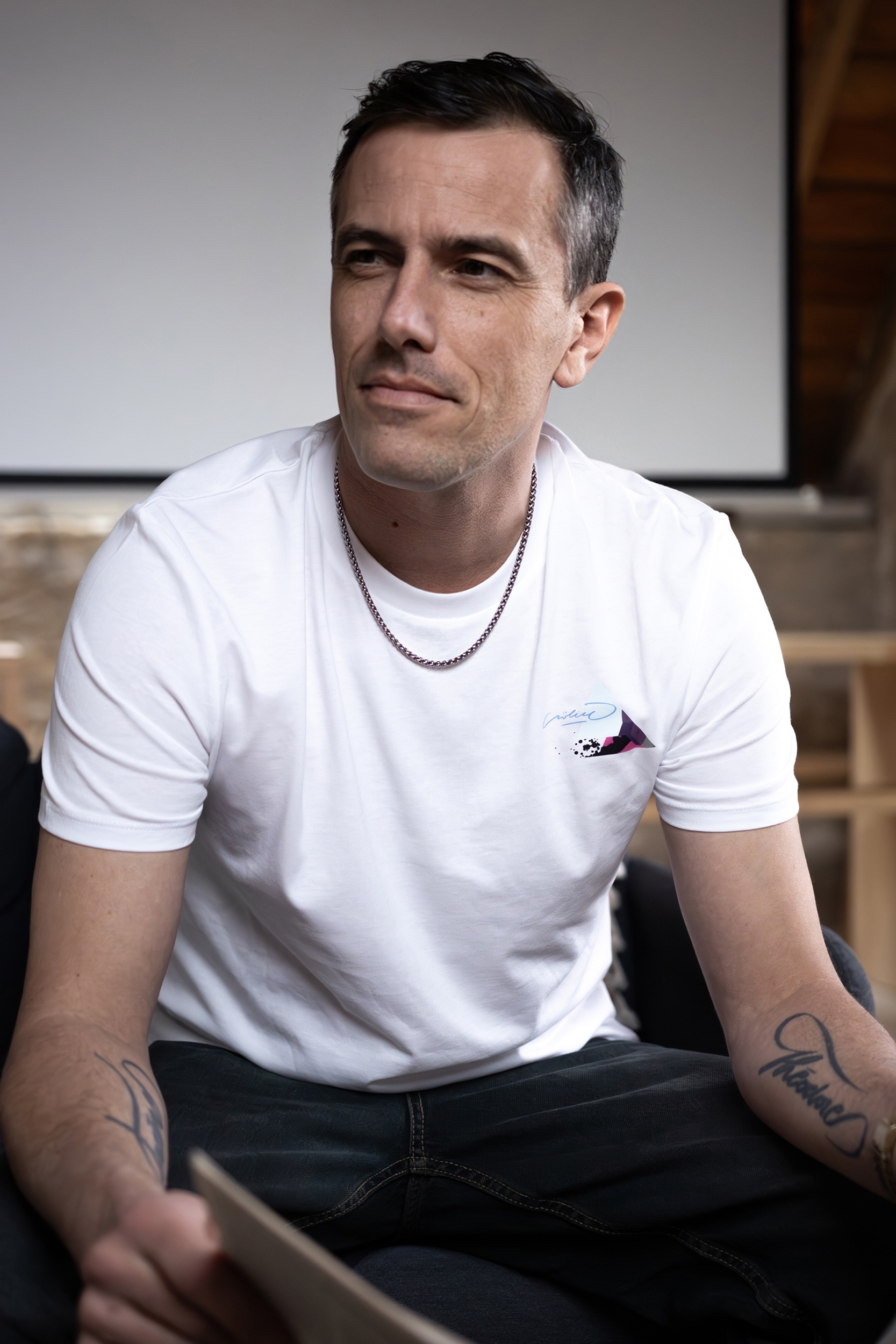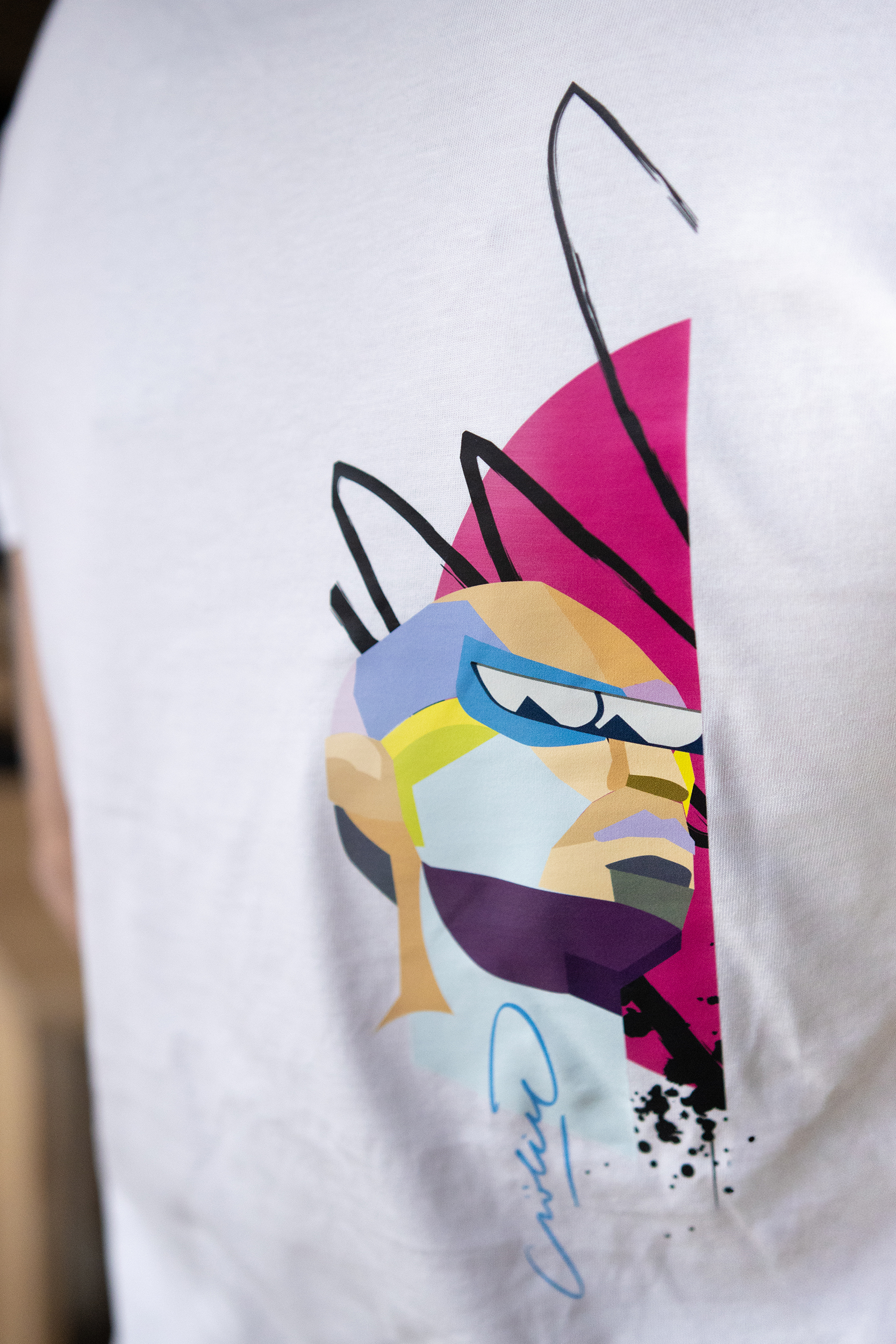 Tee shirt blanc, col rond avec un visuel sur le coeur et le tag SoLiCe avec un élément abstrait triangulaire graphique. Au dos un visage graphique graffer par l’artiste SoLiCe qui reprend l’esprit de Guillaume Mille, personnage qu’il a crée pour le millenaire de caen et graffer sur le Car Ferry de la brittany ferries. ( Le Guillaume de Normandie.)